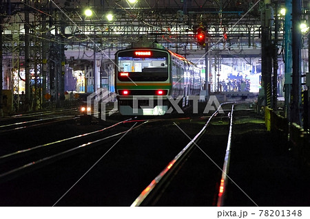 夜の駅に進入する電車のテールライト