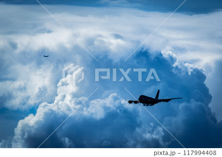 発達した積乱雲に囲まれながら進入する飛行機
