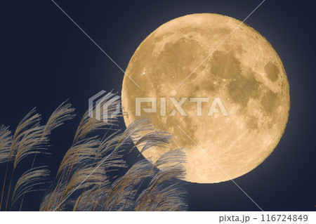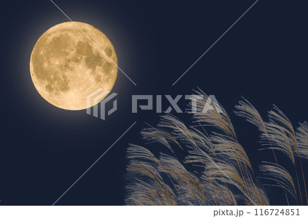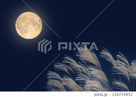 秋の満月の夜とススキの穂|十五夜イメージ