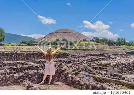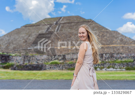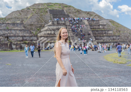 Female tourist standing in front of Teotihuacan pyramids in Mexico, enjoying sightseeing, adventure, and cultural heritage. Travel, tourism, and exploration concept