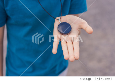 Boy tourist holding and observing a piece of obsidian in front of Teotihuacan pyramids, Mexico, symbolizing cultural discovery, archaeology, and educational travel