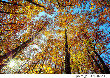 Sunset landscape of Appalachian mountains woods nature in fall season. Colorful forest with yellow canopies in autumn