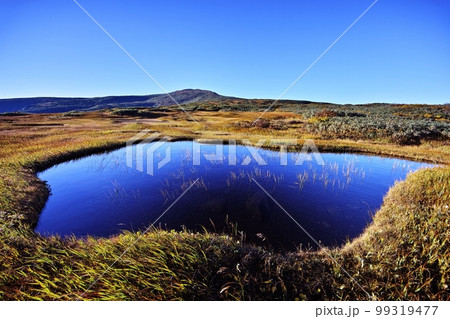 青空を映した弥陀ヶ原湿原の池塘と草紅葉