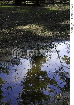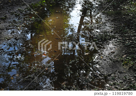 Fallen yellow leaf floats in puddle. Trees reflected on the surface of the water puddle. Autumnal landscape