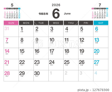 2026年 カレンダー 6月 令和8年 祝日・六曜