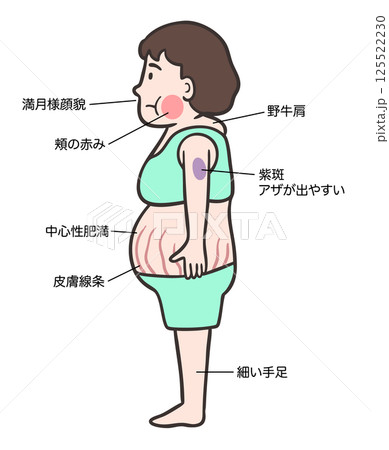 クッシング症候群の女性の側面、 特徴的な体型と症状