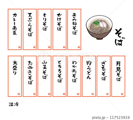 麺類の人気メニューイラスト①(そば、うどん、ラーメン、パスタ)
