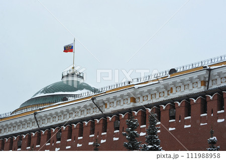 view of the Russian flag at the House of Soviets on Red Square in Moscow