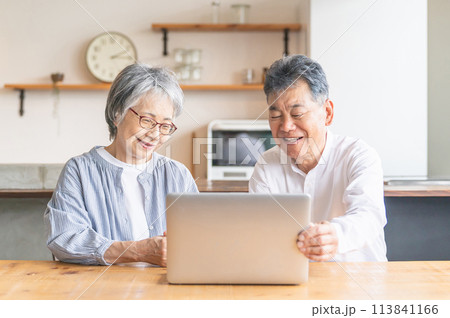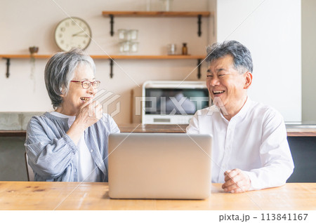 家のダイニングでパソコンを使う高齢者夫婦(爆笑・動画・映画・ビデオ通話)
