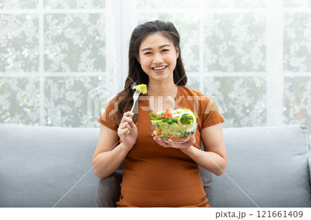 Smiling pregnant woman holding a bowl of fresh vegetable salad, enjoying a nutritious meal at home
