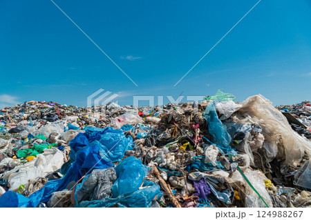 Environmental disaster. Landfill. Plastic scrap in landfill. City garbage