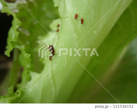 栽培しているサニーレタスの葉に群がるタイワンヒゲナガアブラムシ