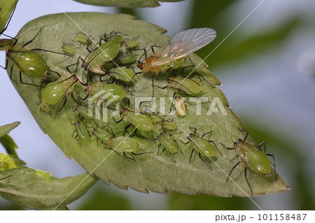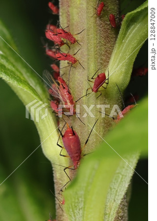 生き物 昆虫 セイタカアワダチソウヒゲナガアブラムシ、六月。有翅型に無翅型と様々な世代が混在する群れ