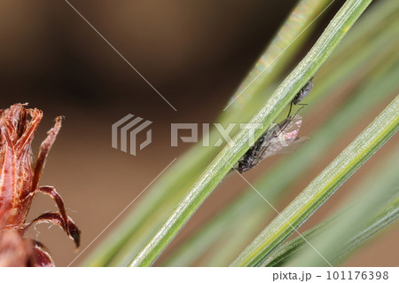 生き物 昆虫 マツホソオオアブラムシ、マツにつくアブラムシ。有翅型と無翅型、大きさは最大二ミリほど