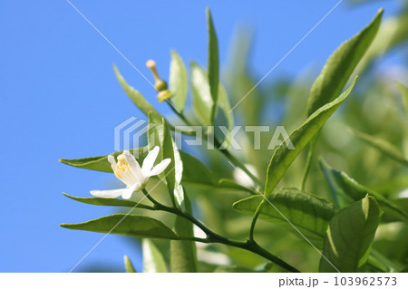 青空バックのデコポン(不知火)の蕾と花と小さい実 横位置