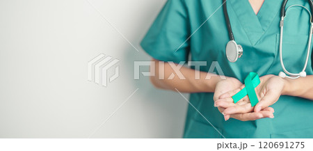 Doctor holding Teal Ribbon for January Cervical Cancer Awareness month. Uterus and Ovaries, Cervix, Endometriosis, Hysterectomy, Uterine fibroids, Reproductive, Healthcare and World cancer day