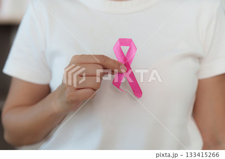Breast cancer awareness. Woman holding pink ribbon on shirt to promote health awareness.