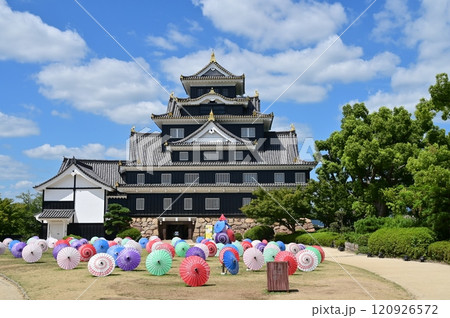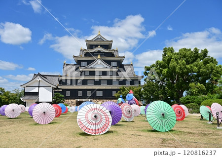 岡山城天守(外観復元)と和傘