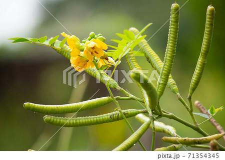 ハブソウ(波布草)の花と鞘、学名:Senna occidentalis、生薬名:ボウコウナン