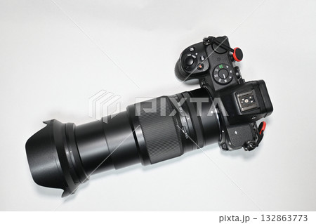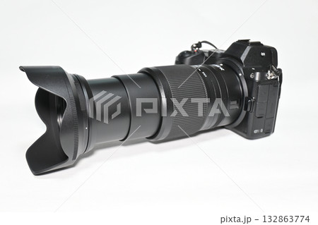 白背景のデジタル一眼レフカメラ 花形レンズフード