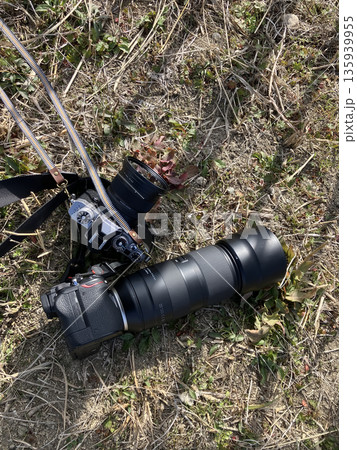 屋外撮影の合間:地面に置かれた2台のカメラ