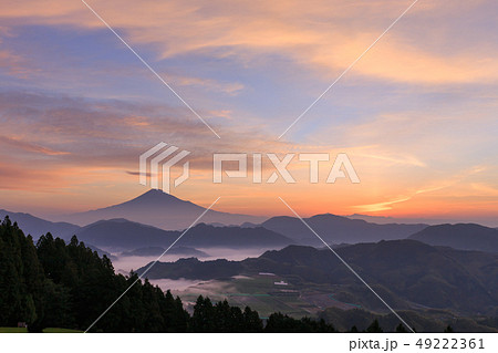 霧のかかった朝焼けの山々、幻想的な雰囲気