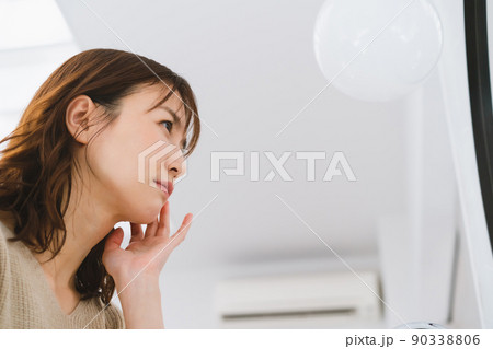 ニキビに悩む20代日本人女性、自然光の洗面所で素肌ケアを意識