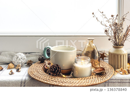 Cozy home composition with a cup of coffee, a candle and decorative details.