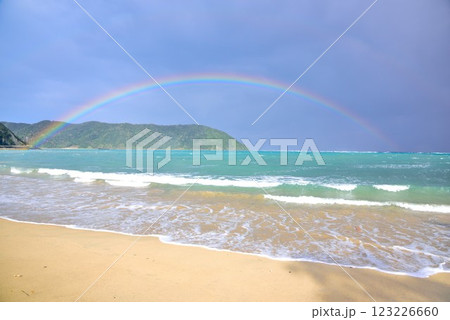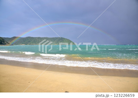 奄美大島 雨上がりの青空と海に架かる虹