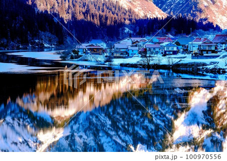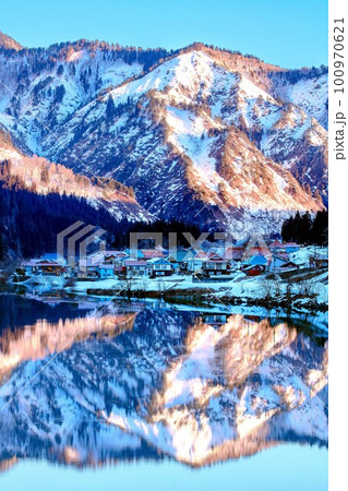 山に朝日差す冬早朝の大志集落(福島県金山町、2月)