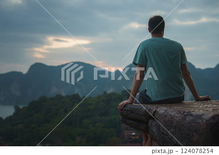 A man sits on a rocky edge, gazing at a forested landscape with distant limestone hills under a cloudy sky, illuminated by soft sunlight in Thailand.