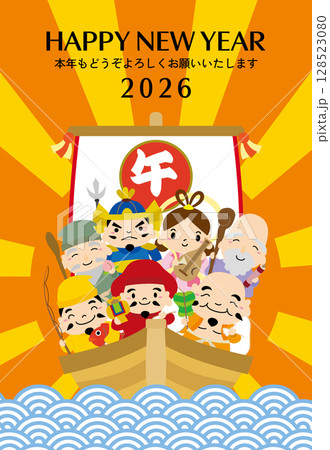 2026年午年の七福神と初日の出の年賀状/縦・文字なし・線あり