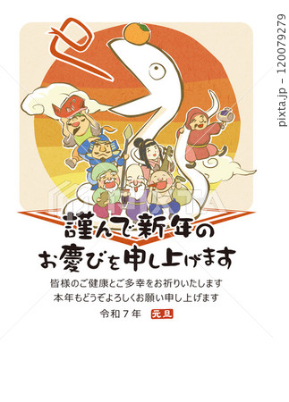 年賀状 デザイン 2025年 巳年 年賀状用テンプレート 新年を祝う七福神とへび