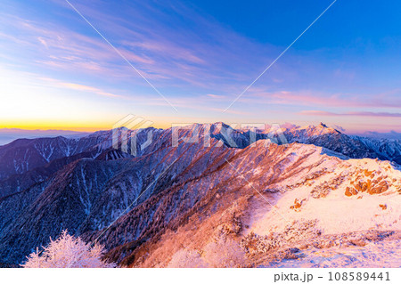 【北アルプス】初冬の冠雪した北アルプスに差し込む朝日【長野県】