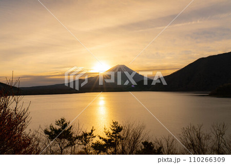【山梨県】美しい精進湖の日の出(8本の光条)と富士山