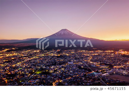 Aerial view of Fuji mountain at sunset in Fujikawaguchiko, Yaman