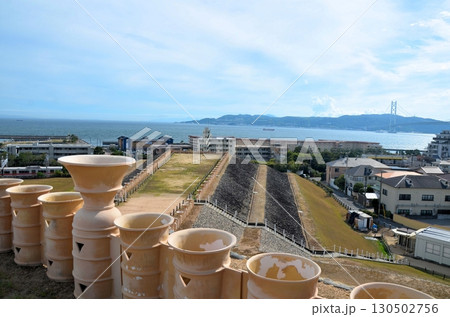 国指定史跡五色塚古墳から淡路島明石海峡大橋を望む