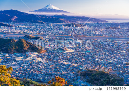 (静岡県)午後の日差しを受ける、静岡市の街並みと富士山