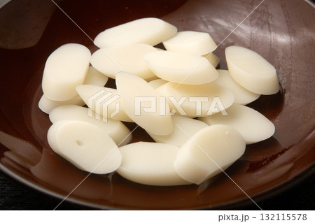 Tteokbokki, Stir-fried Rice Cake : Sliced rice cake bar (garaetteok) or thin rice cake sticks (Tteokbokkitteok) stir-fried in a spicy gochujang sauce with vegetables and fish cakes.
