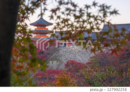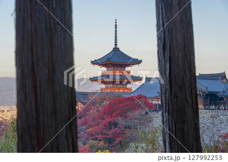 秋の清水寺 三重塔と京都の街並み
