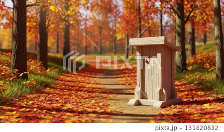 A tranquil path is surrounded by beautiful trees with colorful autumn leaves, illuminated by soft morning light. The warm tones create an inviting atmosphere perfect for a peaceful stroll in nature.