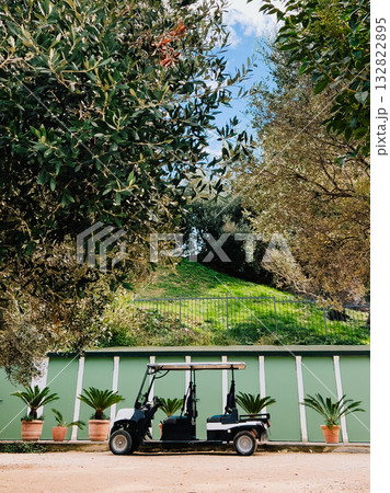 Golf cart parked on dirt road near some olive trees and green wall in park with hill in background, on sunny day with some clouds. Golf cart parked beside olive trees, green wall, hillside backdrop