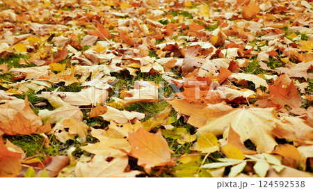 Colorful fallen maple leaves lying on the ground with green grass, autumn season. Shooting in motion with electronic stabilization.