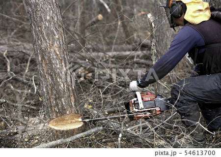 林業 チェーンソーで木を切る人