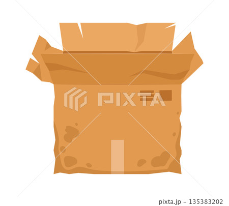 Damaged and ripped package cardboard box. Destroyed wet cargo container, damaged dirty isolated cartoon vector cardboard paper parcel. Broken crushed shipping package or ripped crumpled delivery box
