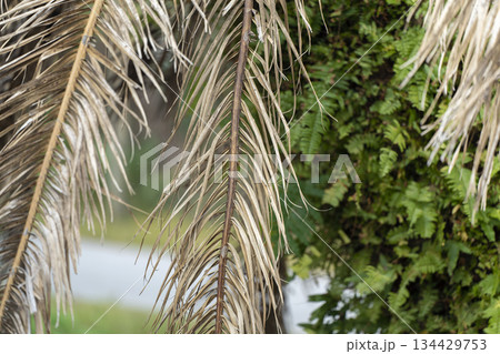 Dead palm tree with dry branches on Florida home backyard. Tree removal concept