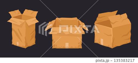 Torn cardboard boxes. Damaged delivery boxes, broken and wet carton shipping containers flat vector illustration set. Crumpled boxes on white background