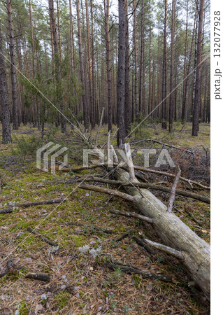 tall pine trees in a forest in the autumn during leaf fall, changes in nature during the autumn in a forest with old and tall pines