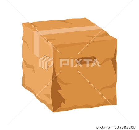 Damaged and crumpled package cardboard box. Damaged dirty delivery package, destroyed crumpled isolated cartoon vector cardboard paper box. Ripped wet cargo parcel or broken crushed shipping container