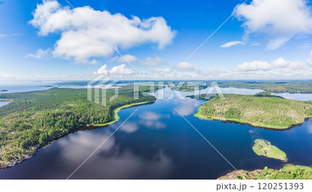 Aerial top view to island in summer evening during white nights. Vuoksa lake river and channels system leaking in Finland and Russia flowing into Ladoga. Romashki village, Leningrad region, karelia.